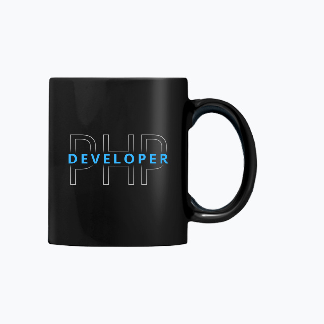 Czarny kubek Premium z autorską grafiką z kolekcji „Developer” w wersji dla programistów PHP.